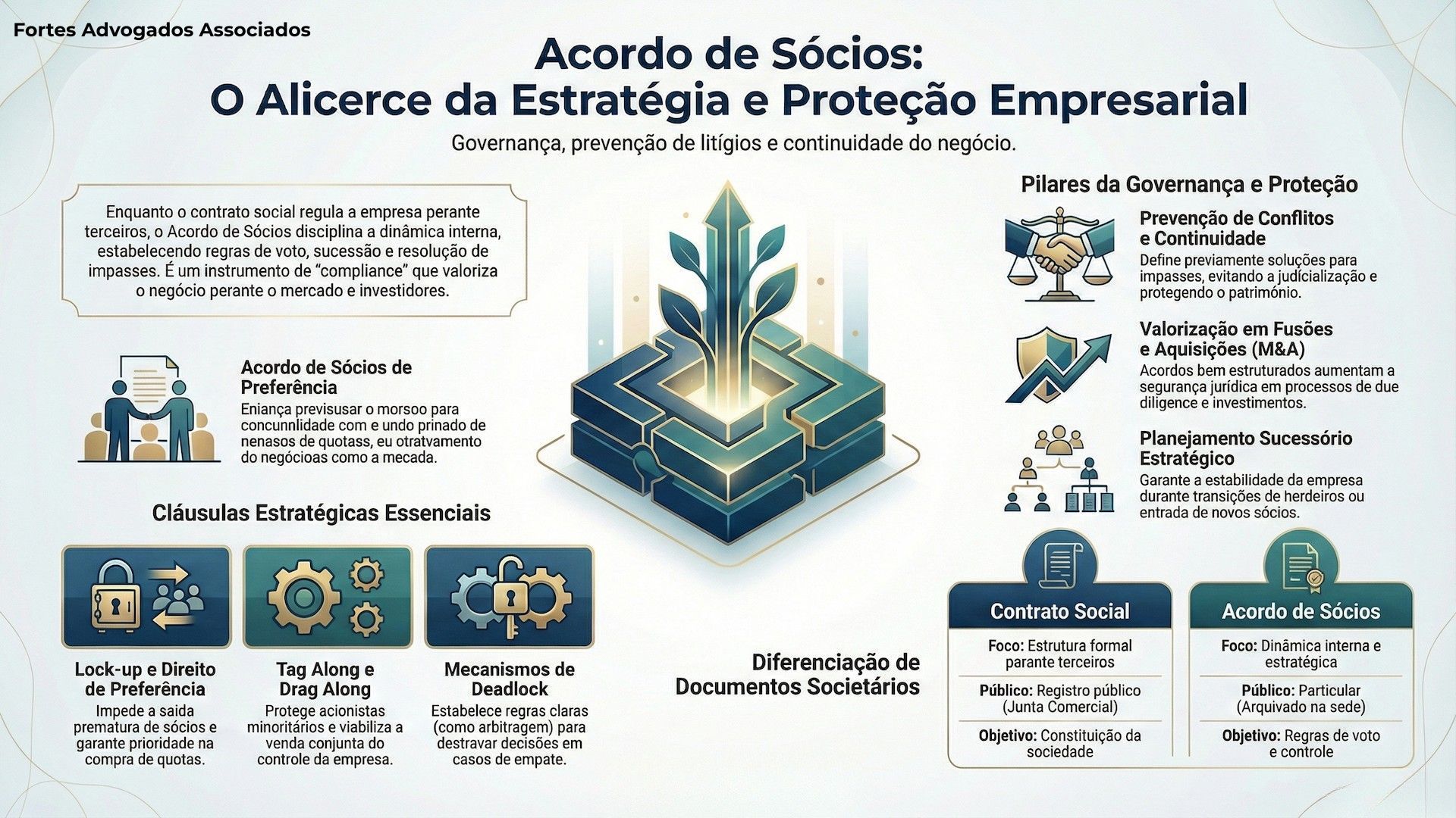 Conforme destacado na área de Direito Societário do Fortes Advogados , a adequada estruturação de acordos societários é fundamental para prevenir conflitos futuros e garantir segurança jurídica aos negócios.