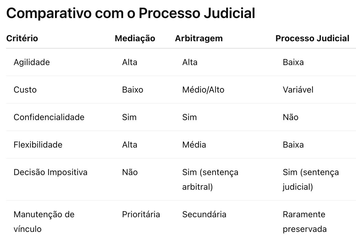 - Há interesse na preservação do relacionamento entre as partes, como em sociedades empresariais, conflitos familiares ou disputas condominiais;